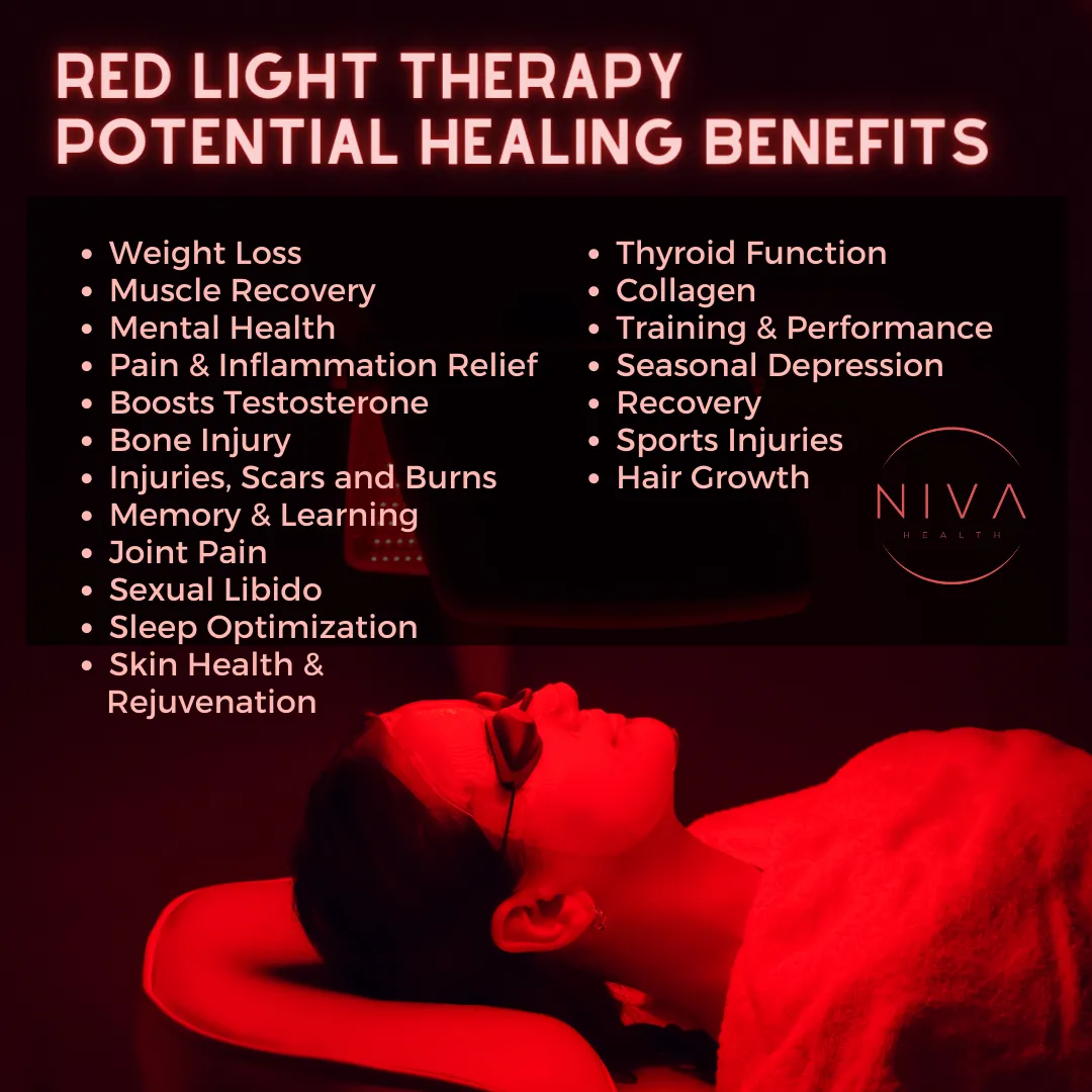 Red light therapy (RLT) is a treatment that uses low-wavelength red light to stimulate healing and reduce inflammation in the skin and other tissues. It is believed to improve skin appearance, reduce pain, promote wound healing, and support muscle recovery by enhancing cellular function and promoting collagen production. The therapy is non-invasive and is often used for skincare, pain management, and wellness treatments.
